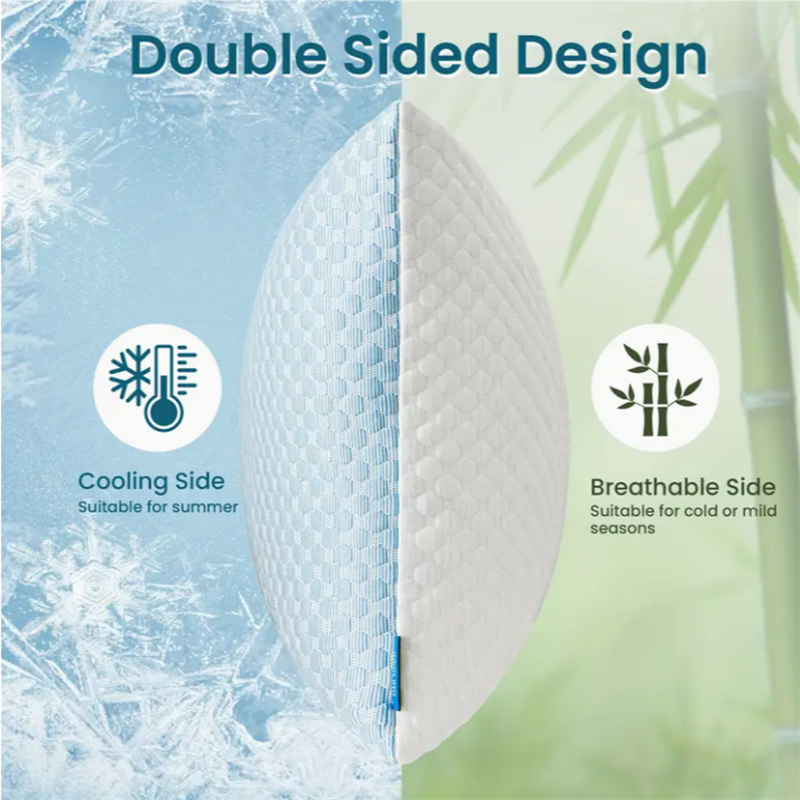 One side features the cooling 3D breathable surface — designed for summer use, it wicks moisture and heat away actively, staying dry and cool even during extended contact on hot nights. The other side features a softer breathable bamboo-feel surface suited for cold or mild seasons that provides gentle warmth without the active cooling effect. Flip based on season or personal preference.