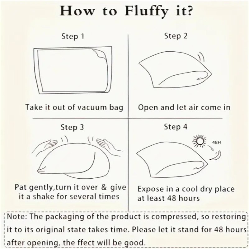 Like the microfiber 1-pack, this pillow arrives vacuum-compressed for efficient delivery. Restore full loft in four steps: remove from vacuum bag, open and let air in, pat gently and shake several times, then leave in a cool dry place for at least 48 hours. The 48-hour standing time is important — the tofu structure takes longer to fully expand than standard fill, and allowing the full 48 hours ensures the pillow reaches its optimal loft and performance.